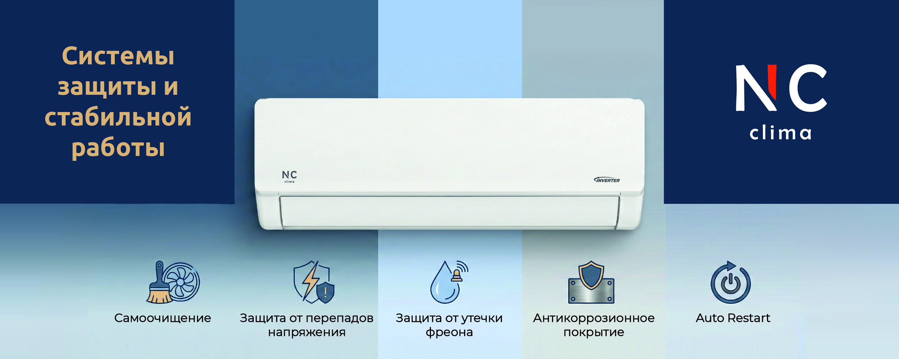 ТМ NC clima заботится о безопасности при использовании оборудования пользователем. Гидрофильное покрытие теплообменников защищает внутренний и внешний блок от коррозии. Обновленная система самоочистки уменьшает накопление влаги и продлевает срок службы оборудования.